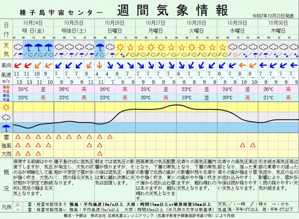 2025年10月25~26日の予報は発雷を含むもので、機体移動の時から制約条件を満たさないことが予想されます。そのため打上げ日が再度変更される可能性があります。