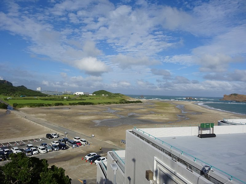 打上げ前日の竹崎展望台から竹崎の海岸方向。いつもは砂だらけの海岸に、大雨による川や池が出来ている。